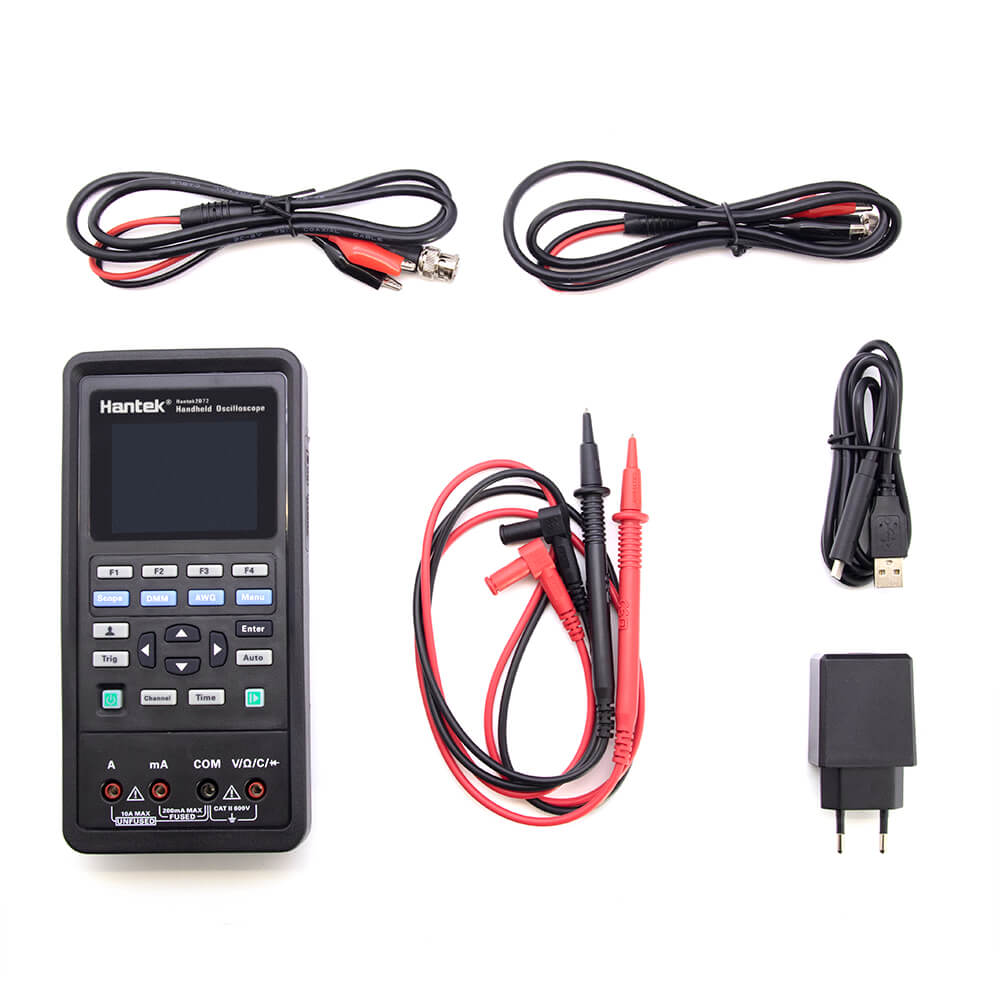 Осциллограф портативный Hantek 2D72 3-в-1 (2 канала, 70 МГц, осциллограф, мультиметр и генератор сигналов) - удобный и недорогой измерительный прибор с функциональным генератором и стандартным набором функций. Читабельный дисплей информативен, а большой клавиатурный блок не вызывает трудностей при работе с прибором. Возможность подключения к ПК позволяет рассматривать вариант прошивки и доработки устройства по своему усмотрению. Специальная подставка предназначена для установки устройства в удобном для пользователя положении. Комплект предусматривает 4 типа щупов, СЗУ с проводом и инструкцию пользователя. Фирменная сумка органайзер обеспечивает удобство транспортировки.